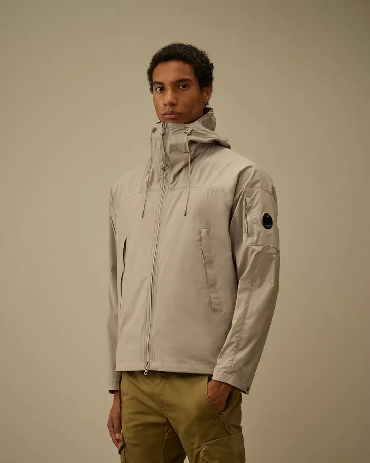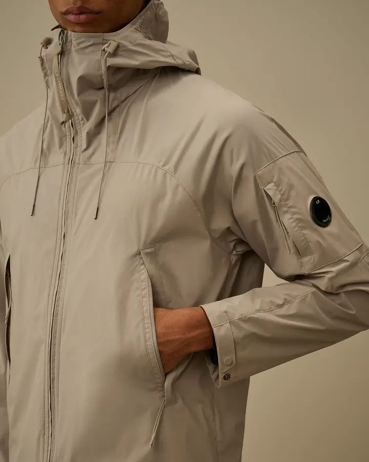 C.P. Company Kapuzenjacke in beige aus Pro-Tek, einem mechanisch dehnbaren Polyester, Anti-Drop-Behandlung. Reguläre Passform. C.P. Company-Linse auf der Ärmeltasche.